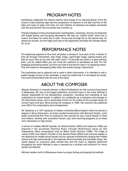 In celebration of mankind's connection to our planet, Michael has created an extraordinary work for band using an intriguing array of composition devices and captivating melodies. Listeners are immersed in a simulated rainstorm, the sounds of world drumming, overlapping tone clusters and textures, and finally a dance of jubilation as the piece comes to a satisfying and rewarding finish. Dur: 7:30