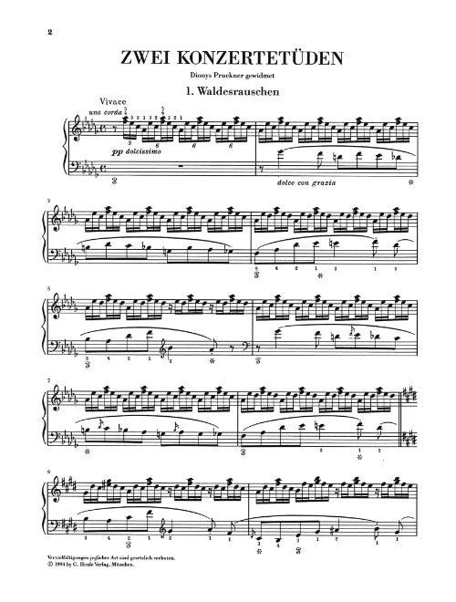 The pianistically demanding studies Waldesrauschen and Gnomenreigen were written during the composer's mature late phase, in which one does not necessarily expect such virtuosic pieces. Liszt composed them in 1862 in Rome for the Grosse theoretisch-praktische Klavierschule by Siegmund Lebert and Ludwig Stark. In so doing he honoured a pledge he had made some time before. Liszt was now teaching a large group of students. The two studies, published in 1863 and independent of the Klavierschule, were dedicated to his extremely gifted pupil Dionys Pruckner. He and other Liszt pupils often played them in concerts.