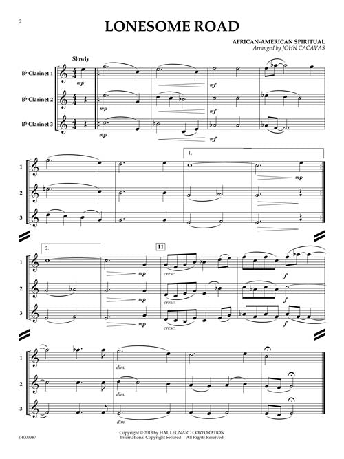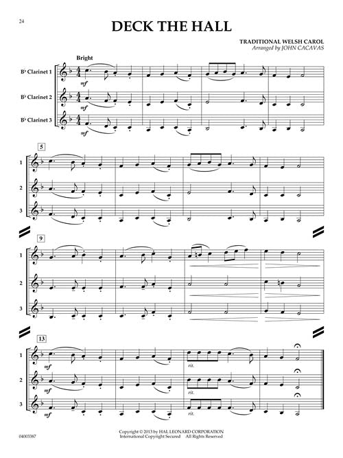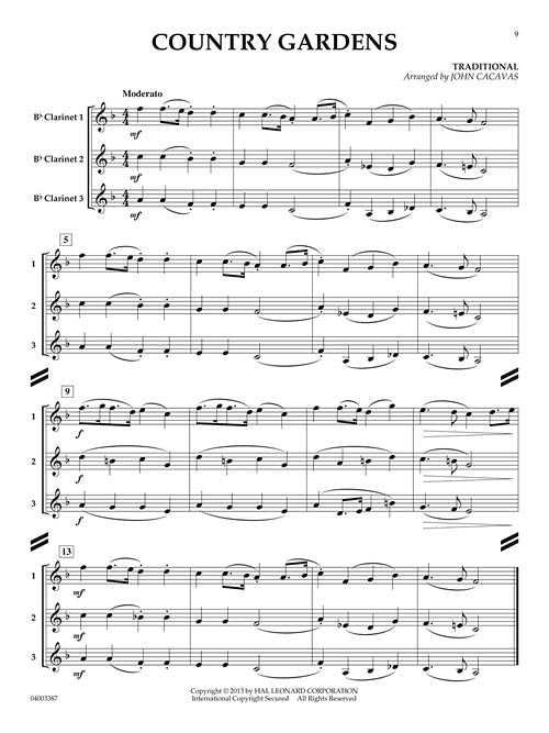 Clarinet trio only (different instrument parts are not interchangeable) Includes: Lonesome Road (African-American Spiritual) · Bagatelle (Beethoven) · Home on the Range (Kelley) · Hymn (J.S. Bach) · Old French Song (Tchaikovsky, Op. 39 No. 16) · Sweet and Low (Joseph Barnby) · Country Gardens (Traditional) · I Heard the Bells on Christmas Day (J.B. Calkin) · The Evening Star (Richard Wagner) · The Star Spangled Banner (J.S. Smith/F.S. Key) · Melody of Love (Englemann) · The Red River Valley (Traditional Cowboy Song) · Good King Wenceslas · Pop Goes the Weasel · Skip to My Lou (Traditional Children's Song)· Auld Lang Syne (Scottish Melody) · O Sole Mio (di Capua) · Waves of the Danube (Ivanovici) · German Dance (Haydn) · Beautiful Dreamer (Stephen Foster) · Deck the Hall