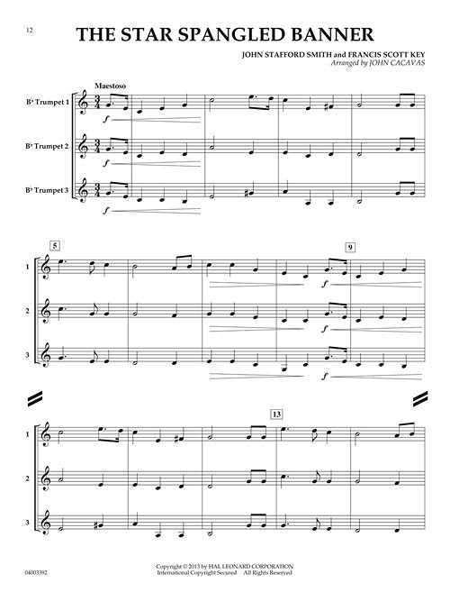 Trumpet trio only (different instrument parts are not interchangeable) Includes: Fanfares (Cacavas) · Pop Goes the Weasel · Silent Night (Franz Gruber/Joseph Mohr) · Deep River (African-American Spiritual) · Swanee River (Old Folks at Home - Stephen Foster) · Sailor's Song (Edvard Grieg, Op. 8 No. 1) · Joshua Fit the Battle of Jericho (Spiritual) · We Wish You a Merry Christmas · Choucoune (Mocking Bird - Haitian Folk Song) · Lonesome Road (Spiritual) · America (My Country, 'Tis of Thee) · The Star Spangled Banner (J.S. Smith/F.S. Key) · The Marine's Hymn (based on a melody of Offenbach) · Minuet No. 1 (from Notebook for Anna Magdalena Bach) · Deck the Hall · For He's a Jolly Good Fellow (Traditional) · The Red River Valley (Cowboy Song) · Skip to My Lou (Traditional) · Frankie and Johnny (Anonymous Blues Ballad) · Auld Lang Syne (Scottish Melody) · Yankee Doodle · Hail, Hail, the Gang's All Here (Arthur Sullivan)