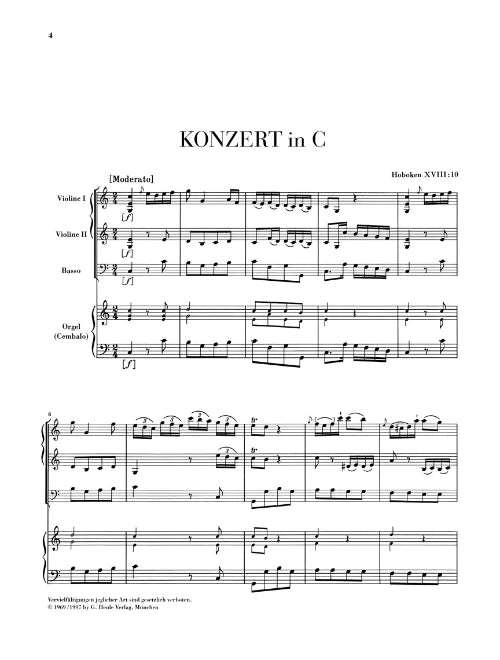 Joseph Haydn left five organ concerti to posterity. Their genesis can only be approximately determined, but is probably datable to the 1750s, when Haydn was still active, inter alia, as organist to Count Haugwitz. The C major Concerto Hob. XVIII: 10, transmitted only in one single manuscript, was not rediscovered until the 1960s and first published by the Henle Urtext edition in 1969. In the sole surviving manuscript, the solo instrument is identified as a harpsichord, but various criteria unequivocally suggest that it was intended for the organ. It belongs to the type of brief, easily playable solo concerto with string accompaniment.