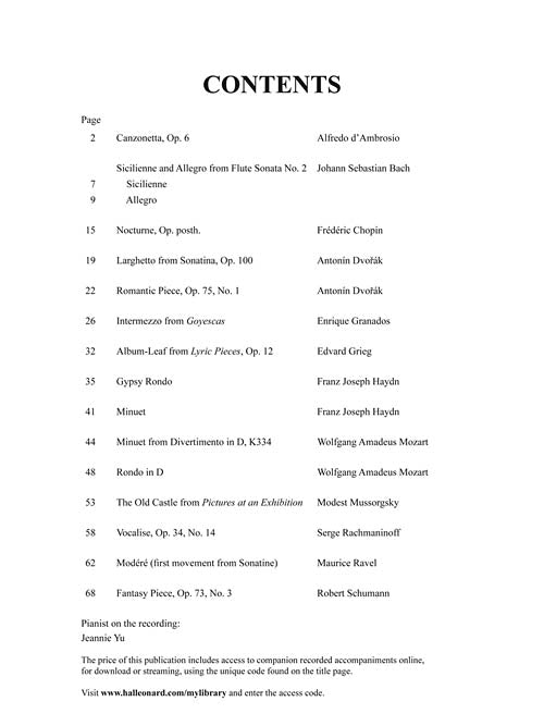 Includes access to recorded accompaniments online, for download or streaming. Contents: Album Leaf (Grieg) · Canzonetta (D'Ambrosio) · Fantasy Piece (Schumann) · Gypsy Rondo (Haydn) · Intermezzo (Granados) · Larghetto (Dvorák) · Minuet (Haydn) · Nocturne (Chopin) · The Old Castle (Mussorgsky) · Romantic Piece (Dvorák) · Rondo (Mozart) · Sicilienne and Allegro (Bach) · Sonatine (Ravel) · Vocalise (Rachmaninoff).