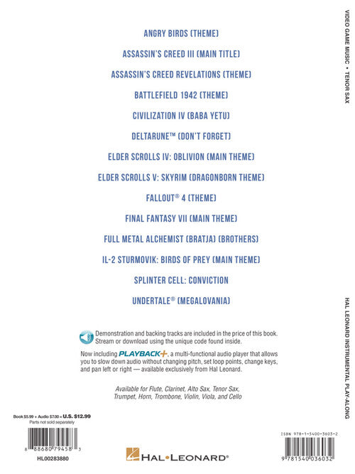 Video Game Music for Tenor Sax Instrumental Play-Along® Series Publisher: Hal Leonard Category: Solo Instrumental Series: Instrumental Play-Along Format: Softcover Audio Online Themes from 14 favorite contemporary video games are included in this collection for beginning...Regular price $15.99 -