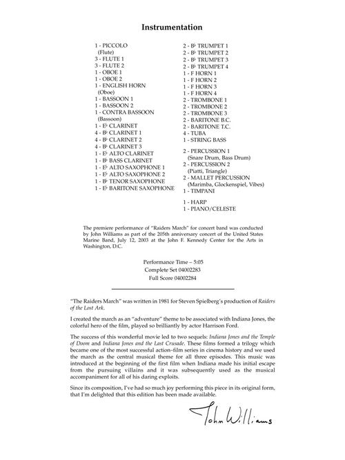 Composer: John Williams Raiders March Score and Parts Publisher: Hal Leonard Category: Band/Orchestra/Ensemble Series: Concert Band Professional Format: Paperback One of the most performed movie themes of all time! Under the careful guidance of Mr. Williams...Regular price $281.99 -