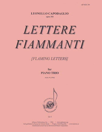 Composer: Leonello Capodaglio Lettere Flammanti Violin, Cello, Piano Publisher: Hal Leonard Category: Band/Orchestra/Ensemble Series: Alliance Series Format: Softcover Lettere Flammanti Violin, Cello, Piano Inventory # : 08777043 UPC: 649325043219 ISBN: Width: 8.5" Length: 11" Height: 0.063"...Regular price $29.99 -