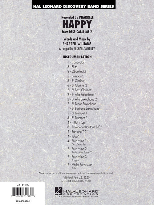 Happy (from Despicable Me 2) Publisher: Hal Leonard Category: Band/Orchestra/Ensemble Series: Discovery Concert Band Format: Paperback Rarely does a song come along that no one seems to get tired of hearing or playing. Happy is just...Regular price $65.99 -