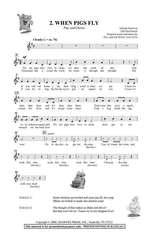 The Singin' and Swingin' at the K-2 Chorale Series includes easy-to-stage mini-musicals specifically designed for primary-age students. The songs, scripts, costumes, and staging suggestions for the series provide a number of performance options that accommodate a wide range of skills extending from kindergarten through second grade, and may even be extended to third grade as well. In A Barnyard Moosical, a hilarious and imaginative mini-musical, we meet a unique and talented group of animals living at this unusual farm. Between the gourmet goats that refuse to eat garbage, a chorus line of hoofing cows, neatnik pigs and funky dancing chickens, the musical will be sure to tickle the imagination and funny bone of performers and audiences alike. This kit contains the director's score, reproducible student parts, and an Enhanced StudioTrax CD that includes an event poster, program, artwork elements and a personal note to the director/teacher from the Gallinas. Duration: ca. 15 minutes. Grades K-2.