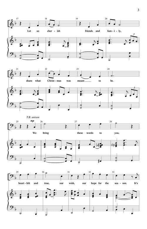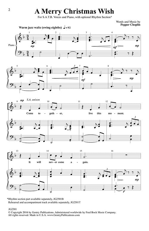 Pepper Choplin has done it again.He has taken one of the classic Christmas concert closers, We Wish You a Merry Christmas, added two new engaging counter-melodies, and wrapped them in an easy swing that invites the audience to sing along.Reminiscent in format to the Christmas classic Peace, Peace, this clever carol setting is sure to follow suit.A rhythm part is available separately as is a performance/rehearsal track.Cue sized-notes enable this voicing to work for middle school choirs on up.Easy. Merry Christmas, everyone!
