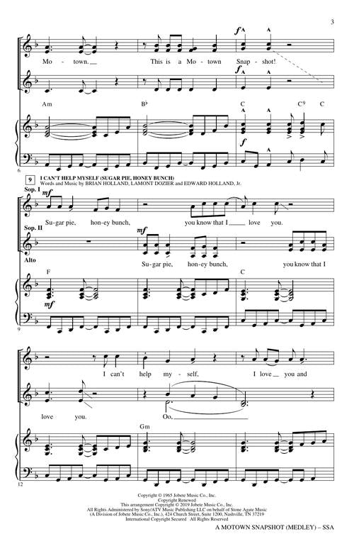 Three classic songs from the Mowtown factory will have your singers and listeners rockin'. Sugar Pie, Honeybunch, Ooo, Baby, Baby, and Signed, Sealed, Delivered, I'm Yours show the range of music coming out of this important studio and add style and energy to your pops concert.