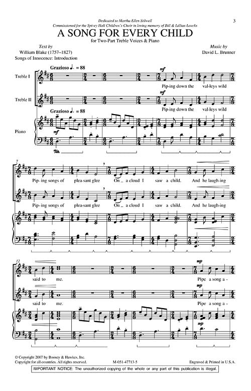 This popular William Blake text has a playful nature, which is reflected in the shifting meters that follow the rhythmic contour and accentuation of the words. The vocal line is light and bright, and encapsulates the joyful spirit of the poem. Duration: ca. 3:00.