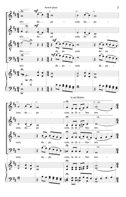 Emerging from a unison pitch the a cappella voices channel through gorgeous suspensions and luxuriously lingering resolutions. This song of peace described in Latin text is immediately timeless and useful in church, high schools and college choirs.