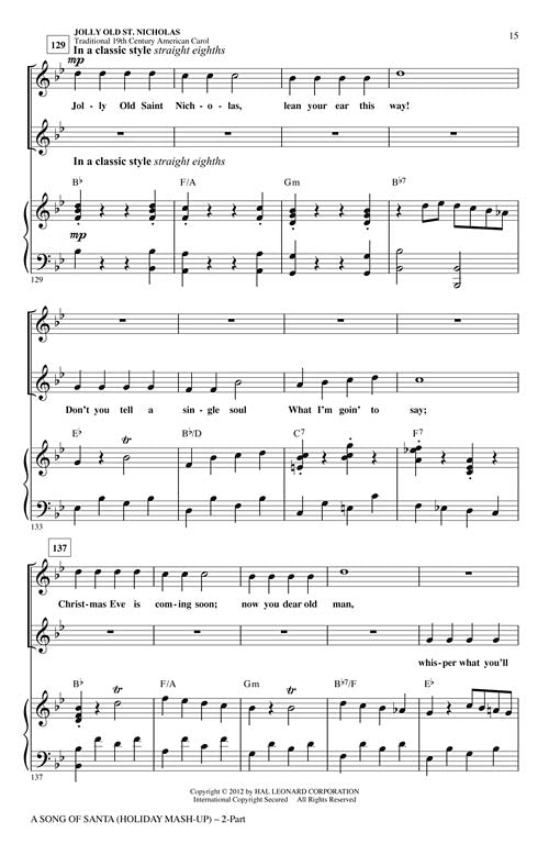 He's the man of the hour...Santa Claus! Liven up your holiday stage with this sparkling and fast-paced 9-minute mash-up of these top seasonal favorites: Dig That Crazy Santa Claus; Here Comes Santa Claus (Right Down Santa Claus Lane); I Saw Mommy Kissing Santa Claus; Jolly Old St. Nicholas; Little Saint Nick; (Everybody's Waitin' For) The Man With the Bag; Mister Santa; Must Be Santa; Santa Baby; Santa, Bring My Baby Back (To Me); Santa Claus Is Comin' to Town; Up on the Housetop. Available separately: SATB, SAB, 2-Part, ShowTrax CD. Combo parts available digitally (tpt 1, tpt 2, tsx/fl, tbn, bsx, syn, gtr, b, dm). Duration: ca. 8:30.
