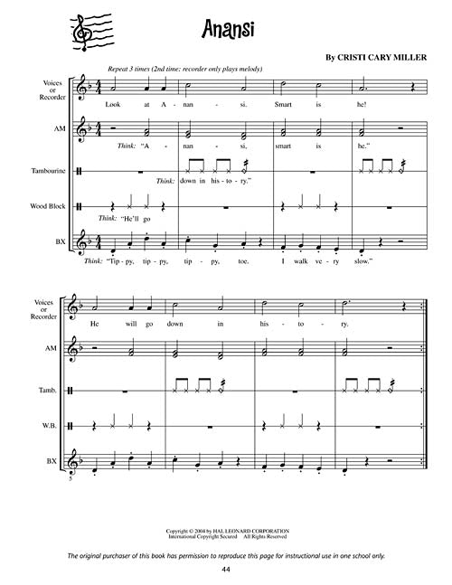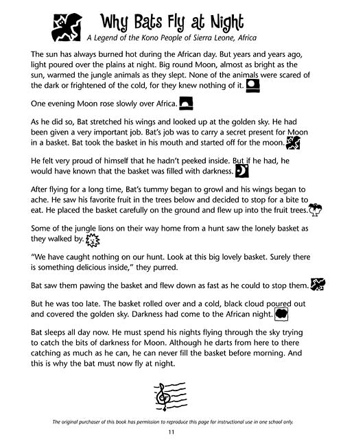 Folk tales come alive with sound and movement in this creative cross-curricular resource perfect for the classroom or on stage. Renowned educator and clinician Cristi Cary Miller provides instructive teaching tips on how to dramatize each of the 8 interactive stories, which are enhanced with musical sound effects played by the students for added color and vision, and a meaningful moral behind each tale for all who participate and listen! A variety of reproducibles are included for ease in preparation and presentation, including the stories and sound effects using picture icons and original songs that accompany the stories, each complete with Orff/piano arrangements. Add a fresh new dimension to your curriculum this year with A TAPESTRY OF TALES. Folk tales as adapted by Jennifer Bennett include: Apple Dumplings (England), Why Bats Fly at Night (African folk legend), The People Who Hugged Trees (India), The River Dragons (China), Turnip Soup (Russia), Spider Stories (Jamaica), The Love of Talwalpin and Kowinka (Australian Aboriginal story), The Raccoon and The Bee Tree (Native American). For Grades 1-6. Available: Musical Story Collection (with reproducible pages).
