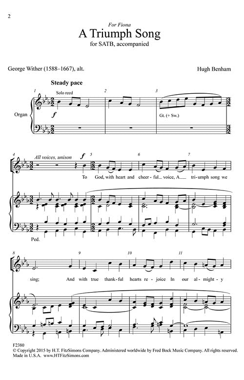 That glorious, lofty, English cathedral sound emerges easily from British composer Hugh Benham. Using a text by 17th century author George Wither, Benham uses a hymn-style format, typical of Anglo-anthems. Accompanied by organ, this anthem celebrates the ascension yet works equally well for general use. Easy to medium.