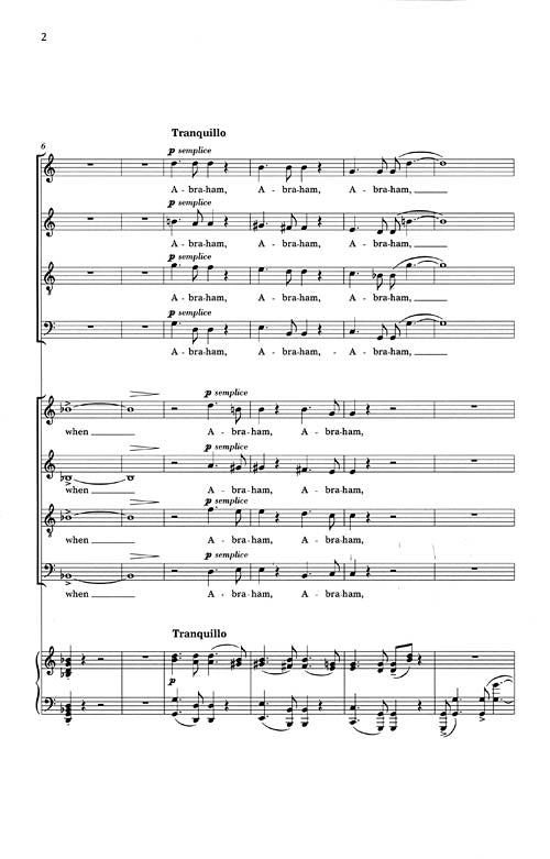 This 6-minute sacred motet by John Harbison was premiered in January 2004 at the Vatican. Featuring a text from Psalm 17, it was composed to strengthen the ties between the Jews, Christians and Muslims and depicts Abraham as father of many nations - in Harbison's words: a bridge, a mode of communication and a point of commonality. An accessible work for both concert and worship.