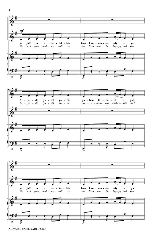 It isn't very often that you get a chance to perform music from the Middle East! This setting of an Arabic folksong isn't difficult and the percussion patterns are easily performed by your singers.Available separately: 3-Part Mixed and 2-Part. ShowTrax CD also available. Performance Time: Approx. 2:00