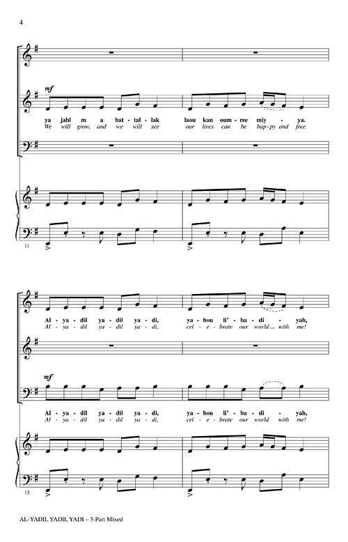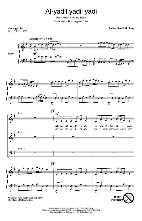 It isn't very often that you get a chance to perform music from the Middle East! This setting of a Palestinian folksong isn't difficult and the percussion patterns are easily performed by your singers.Available separately: 3-Part Mixed and 2-Part. ShowTrax CD also available. Performance Time: Approx. 2:00
