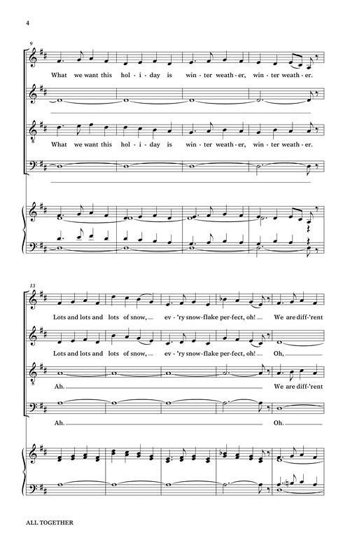 Recorded by the New York Concert Singers and premiered at the Lincoln Center Tree Lighting by Project Youth Chorus and the Muppets, this sweet a cappella setting is a simple and warm salute to the December holidays especially appropriate for diverse audiences. We are different and the same, all together. What we want this holiday is peace forever. The full recording is available at www.newworldrecords.org and dramonline.org. (Lance Horne, All Together, New World Records NW80592. P 2001 C 2001, Anthology of Recorded Music, Inc. Used by permission).