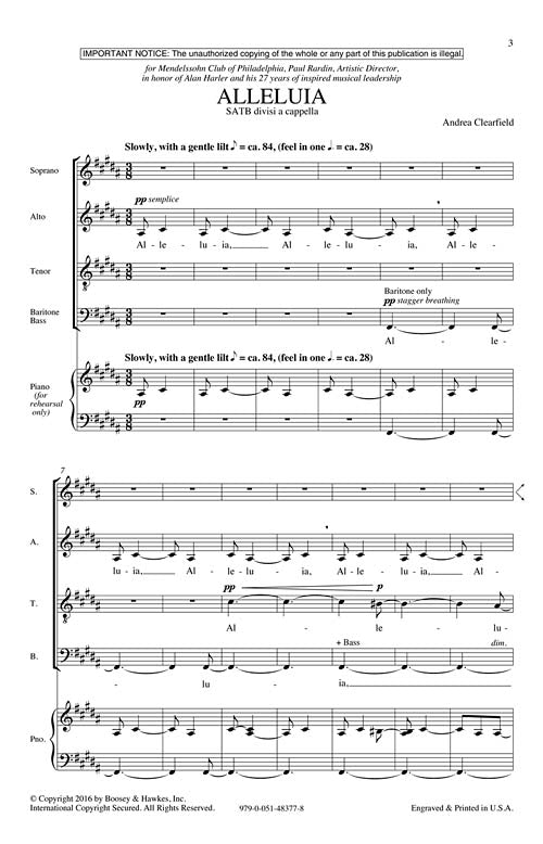 Beginning with two main thematic ideas that are developed throughout the work: a 2-note gentle, lilting motive and a 4-note lyrical theme that travels throughout the voices, this 7 minute piece for a cappella chorus will challenge any fine chorus. The use of triangles and simple body percussion near the end engage both the listener and the performers in a magical and heartfelt experience.