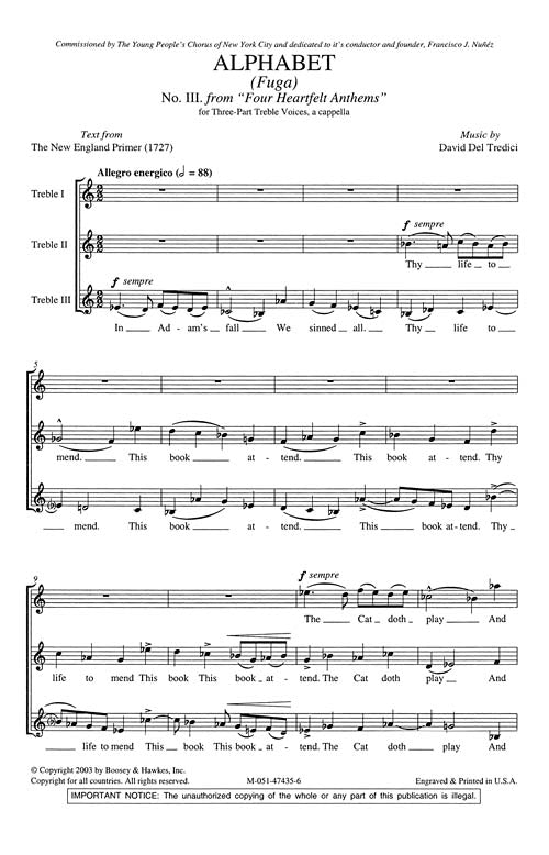 David Del Tredici writes: My setting of the 1727 New England Primer's Alphabet might horrify its Puritan author by transforming its simple text into an exuberant tour de force. Its 26 couplets tumble upon one another in tight three-part counterpoint, testing the young performers' range and endurance alike.
