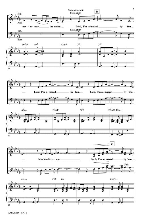 Although we may sometimes overlook His presence and work in our lives, it is amazing to know that God loves us. This tender song of devotion features soloist, choir, and optional praise team. Orchestration includes score and parts for Flute 1, 2, Oboe, Clarinet 1, 2, Trumpet 1, 2, 3, Horn 1, 2 (Alto Sax), Trombone 1, 2 (Tenor Sax/Baritone TC), Trombone 3/Tuba, Percussion 1, 2, Drum Set, Harp, Rhythm, Violin 1, 2, Viola (Clarinet 3), Cello/Bassoon (Bass Clarinet), String Bass and Keyboard String Reduction. CD Accompaniment Trax also available. Duration: Approx. 5:30