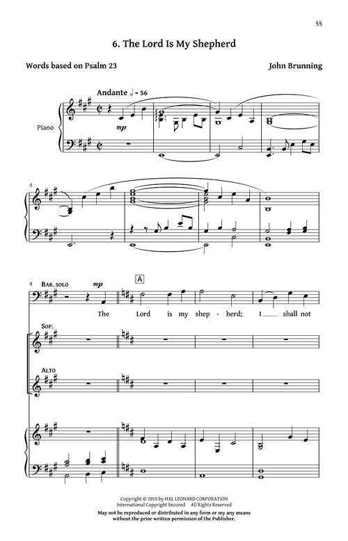 From John Brunning, English composer, musician and radio personality, this larger work offers an uplifting message ideal for worship, ecumenical events and sacred concerts. Includes 7 movements: Amazing Day; The Lord's Prayer; Pie Jesu; Introit, Kyrie, Sanctus; Ave Maria; The Lord Is My Shepherd; Hallelujah.