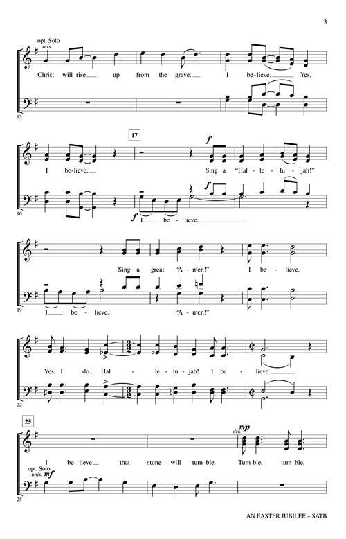 Uses: Easter Scripture: Luke 24:2-3; Acts 4:33; I Peter 1:3 Teeming with gospel goodness, this unaccompanied gem is a charming change for Resurrection Sunday. The infectious call and response format causes this toe-tapper to be a positive sonic alternative to the brassy shimmer of traditional Easter offerings. Modest ranges with much repetition make this an easy learn, and optional cued notes and some reserved vocal splits will allow for larger groups to really shine!