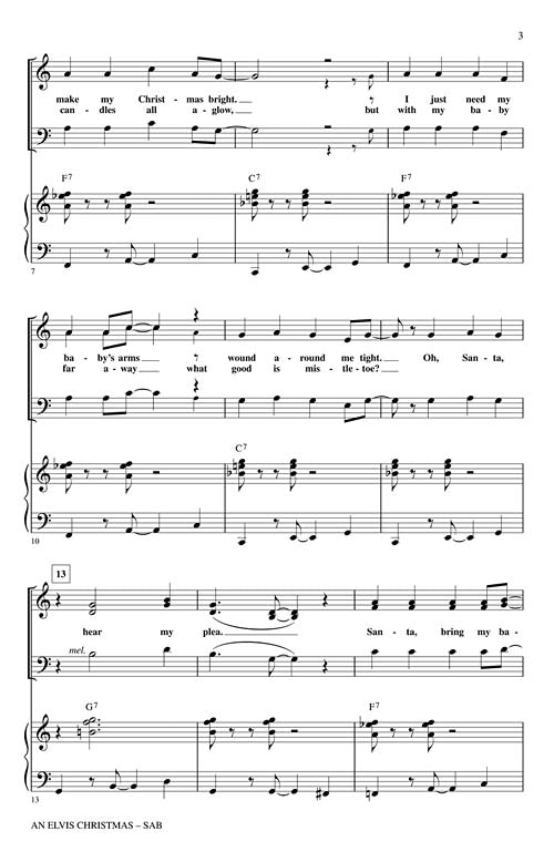 Santa is definitely in the building with this fun 4-minute medley of Christmas songs identified with the King of Rock & Roll. Includes: Blue Christmas, Santa, Bring My Baby Back (to Me), Santa Claus Is Back in Town. Available separately: SATB, SAB, TBB, 2-Part, ShowTrax CD. Rhythm parts available digitally (synth, gtr, b, dm). Duration: ca. 4:00.