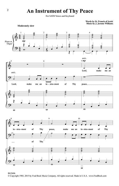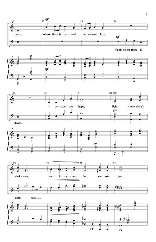 The words of St. Francis of Assisi have beckoned to composers for centuries. What makes this one stand out is the noble setting. Although beginning quietly, it builds steadily in a regal fashion. This sacred text is so well-known that it may be appropriate in church or school. Easy-medium.