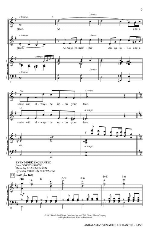 After a 15-year wait, Alan Menken and Stephen Schwartz re-teamed to pen the songs for the sequel to Disney's 27 hit film Enchanted. Featuring a fresh locale transplant from downtown New York City, re-acquaint your choir with Gisele and the whole gang as they take you through a cheery musical introduction to the intersection of Andalasia and Suburbia!
