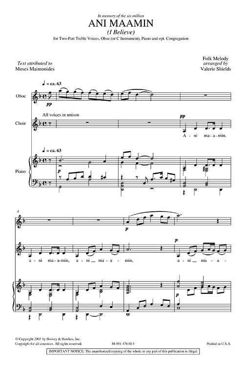 A meaningful arrangement of this traditional Hebrew folk melody, whose opening words Ani Maamin mean I believe. A solo oboe adds expressive power to this setting for two-part treble chorus. With piano.