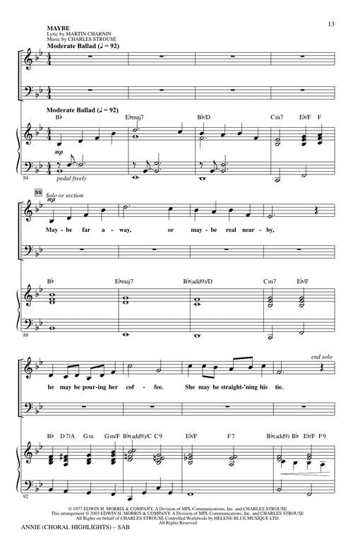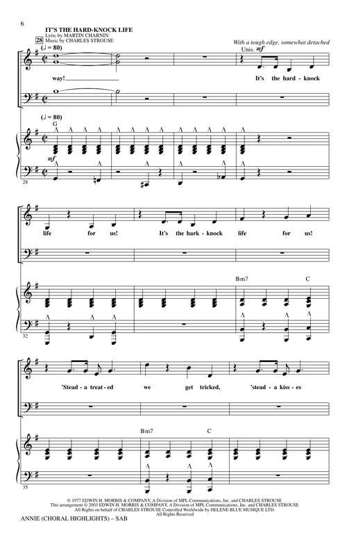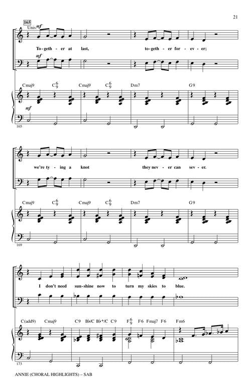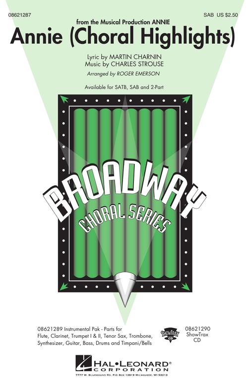 She's America's sweetheart! Perform this delightful 7-minute medley in your next concert. Includes: I Don't Need Anything But You, It's the Hard-Knock Life, Maybe, You're Never Fully Dressed Without a Smile, Tomorrow. Available: SATB, SAB, 2-Part, IPak (Flute, Clarinet, Trumpet I & II, Tenor Sax, Trombone, Synthesizer, Guitar Bass, Drums and Timpani/Bells), ShowTrax CD. Approx. Time: 7:00.