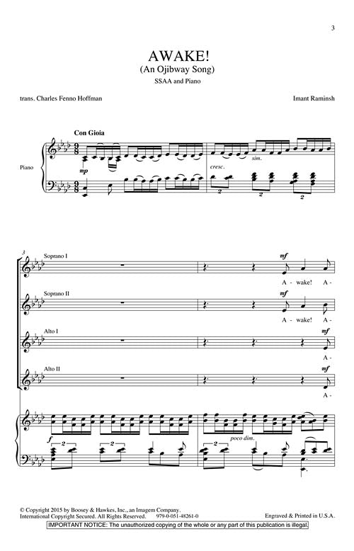 This Ojibwa text, adapted by the composer, explores the beloved flower of the forest, Sky-treading bird of the prairie, wonderful fawn-eyed one. Opening with a joyful fanfare-like exclamation of the word Awake and ending as though in soaring flight, this is an excellent selection for advanced women's choir repertoire.