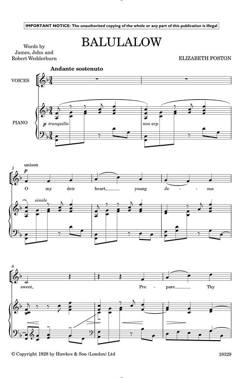 Balulalow is a simple but effective carol, starting with a unison, lilting melody which breaks into two parts for the second verse. This carol, for many years out-of-print, is here restored to the choral repertoire as part of the Boosey & Hawkes Choral Treasury. Drawing upon a rich archive, the Boosey & Hawkes Choral Treasury presents a wealth of choral opportunities for choirs of all types and abilities wishing to explore new choral territories. A perfect resource for accessible and inspiring choral masterworks of the twentieth century and beyond, this series restores many difficult to obtain sacred and secular classics to the repertoire. Text: O my deir heart, young Jesus sweet, O my deir heart, young Jesus sweet, And I sall rock Thee in my heart, And never more from Thee depart. But I sall praise Thee ever moir With songes sweet unto Thy gloir; The knees of my heart sall I bow, And sing that richt Balulalow!