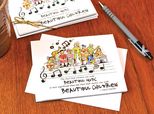 5-1/2 inch. x 4-1/4 inch. colorful notecards with Cheryl Lavender's inspirational quote, The fact that children can make beautiful music is less significant than the fact that music can make beautiful children. Illustration by J. Stuart Hill, printed with glossy outside and matte, blank inside. 10 cards and 10 envelopes per set.
