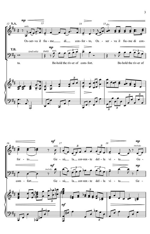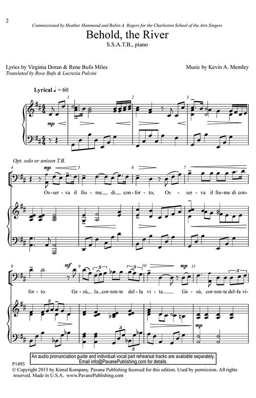 Kevin Memley's music fits the Italian text so well that it sounds like a folk song we should know. The steady river is a metaphor for comfort. The sacred overtones from the text enable this piece to work in worship as well as concert. Easy to Medium difficulty.