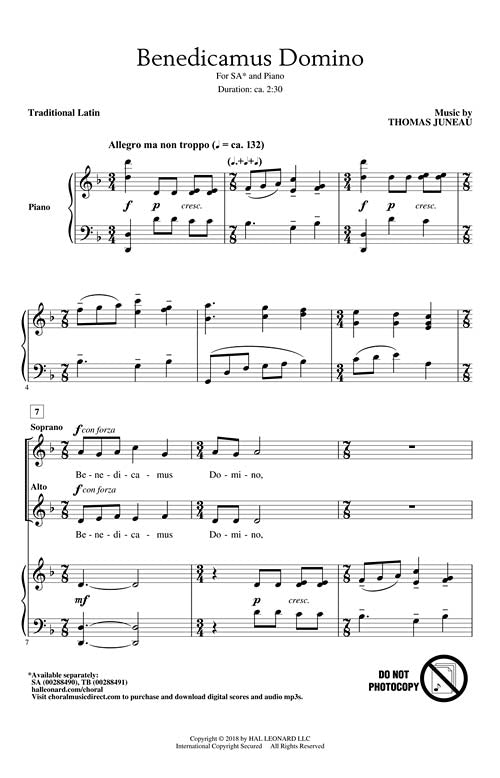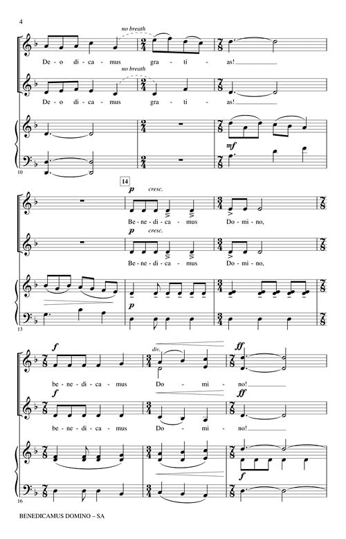 The constant switch between 3/4 and 7/8 keeps this piece fun and exciting, with easy and bright melodic lines all the way through. Choirs of all levels can enjoy singing this work, set with traditional Latin text. Available for both SA and TB choir.