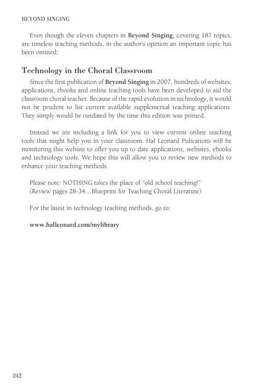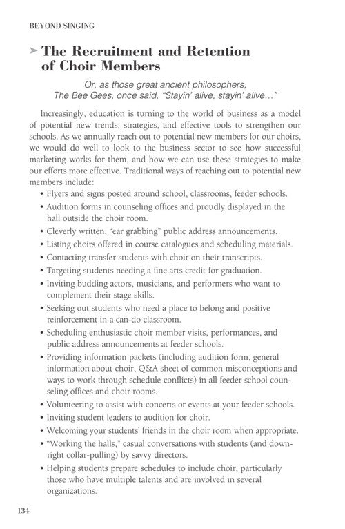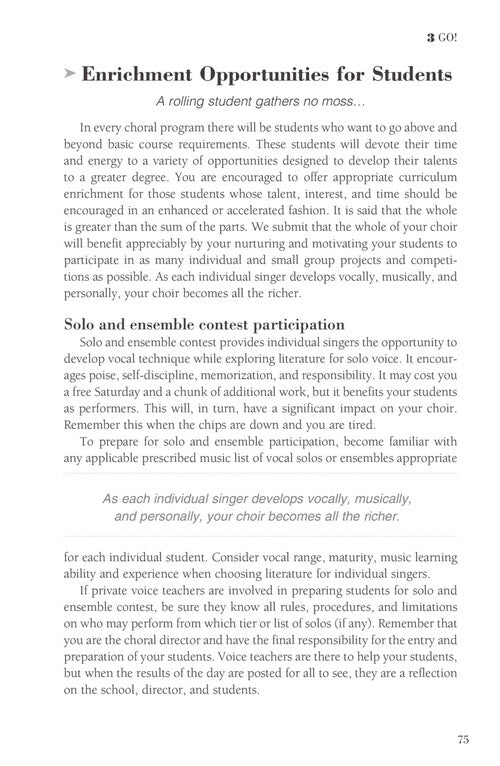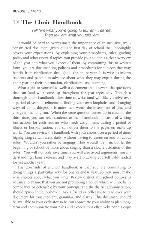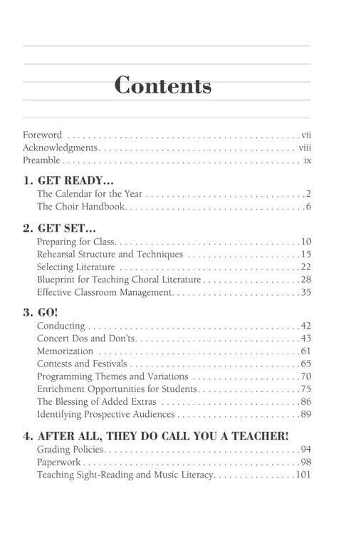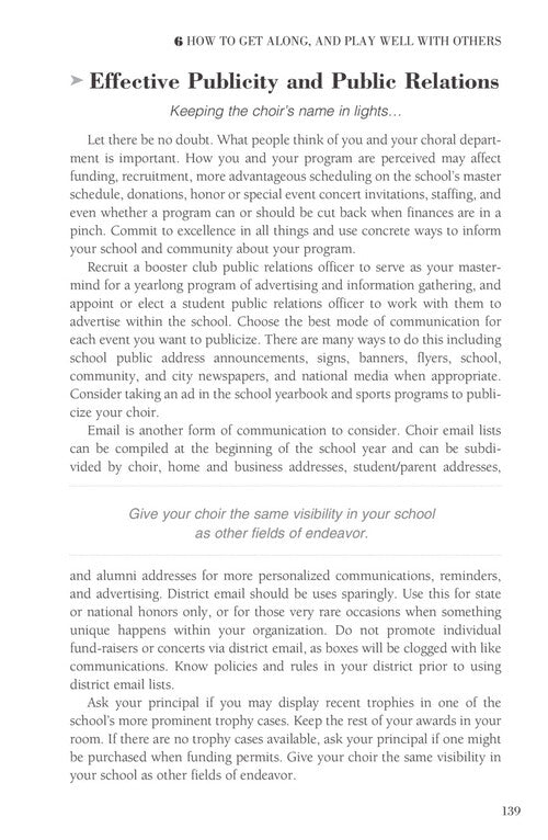 Excellence is not something stumbled upon by accident. You won't achieve great things while flailing about in paperwork nor partake of true musical artistry by folly. Success requires a concrete plan of action: a big-picture plan followed by all the little details that, together, create a complex mosaic that forms a beautiful and intricate picture of choral excellence. This practical text offers a wealth of information for running a choral program. The two successful veteran teachers offer advice for dozens of solutions to issues facing the choral director. Includes online bonus material, an introduction by Paul Salamunovich, and these chapters: 1. GET READY... The Calendar for the Year, The Choir Handbook. 2. GET SET... Preparing for Class, Rerhearsal Structure and Techniques, Selecting Literature, Blueprint for Teaching Choral Literature, Effective Classroom Management. 3. GO! Conducting Concert Dos and Don'ts, Memorization, Contests and Festivals, Programming Themes and Variations, Enrichment Opportunities for Students, The Blessing of Added Extras, Identifying Prospective Audiences. 4. AFTER ALL, THEY DO CALL YOU A TEACHER! Grading Policies, Paperwork, Teaching Sight-Reading and Music Literacy. 5. TAKING CARE OF BUSINESS Copyright Law for the Choral Director, The Art of the Interview, Teacher Observations and Evaluations, Professional Resources. 6. HOW TO GET ALONG AND PLAY WELL WITH OTHERS Building Your Support System, The Recruitment and Retention of Choir Students, Effective Publicity and Public Relations. HOW TO DO STUFF Fund-Raising, Uniforms, Music Library Organization and Maintentance. 8. HOW TO KEEP THE TAIL FROM WAGGING THE DOG Show, Pop, Jazz, and Swing Choirs, Chamber Singers and Madrigal Groups. 9. WHO SAYS CHOIR IS BORING? Choir Traditions, Fun and Games, Trips, Tours, Parties, and Banquets. 10. ALL THE REST THAT'S FIT TO PRINT... Topics Overlooked in MusEd 101, The Great Miscellany of It All. 11. VAULTING INTO THE BIG LEAGUES VIPs of the Profession, You Are Cordially Invited..., International Travel Technology in the Choral Classroom Epilogue, Table of Contents Appendix, Index