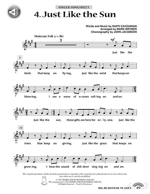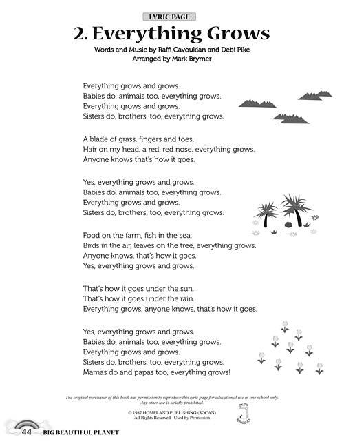It's up to me, it's up to you. Help this planet earth to stay evergreen, everblue! These words from popular children's songwriter, Raffi, celebrate our earth - our home, and the importance of working together to take care of it. Share this message and make a difference in your school and community this year! This 15-minute revue can be performed in the classroom or on stage. It features five songs by Raffi, piano/vocal arrangements with simple movement suggestions, reproducible singer parts and short connecting narrations you can easily adapt for groups of varying sizes. Available separately: Teacher Edition, Performance/Accompaniment CD, Classroom Kit (Teacher and P/A CD). Approximate Performance Time: 15 minutes. Suggested for grades 2-4.