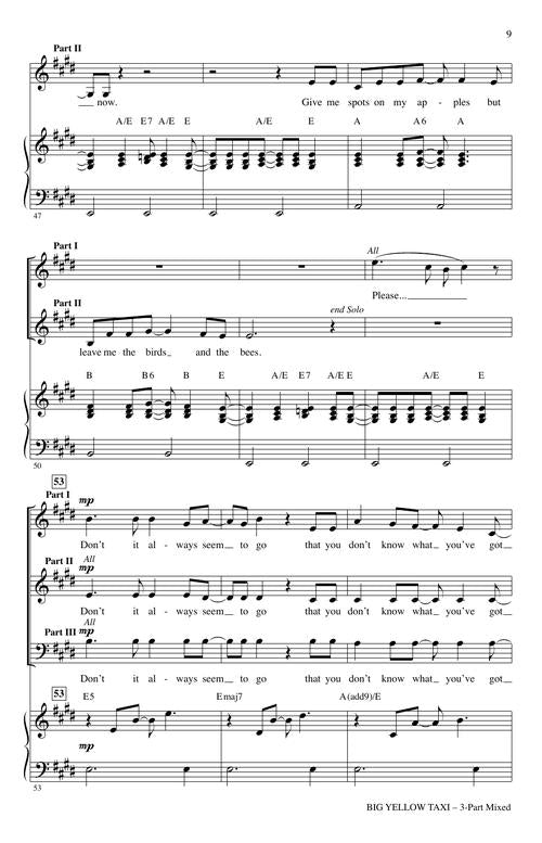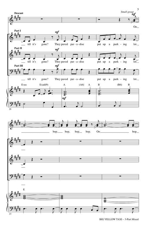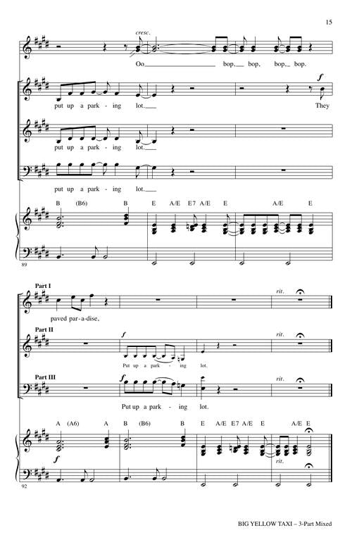Joni Mitchell's song, Big Yellow Taxi, remains one of pop music's favorite all-time hits. Arranged especially for developing choirs, this arrangement provides easy vocal parts that repeat each time the refrain is sung. Opportunities for optional solos are also provided when singing the verses. Highlighting concerns for environmental care, the song speaks poignantly to important global issues.