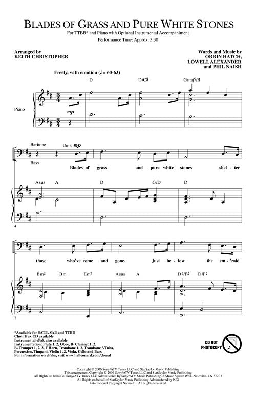 From the pen of Senator Orrin Hatch, Lowell Alexander and Phil Naish, we present a moving tribute to those who have given their lives defending our country. Blades of grass and pure white stones cover those who left their homes.Available separately: SATB, SAB and TTBB. Instrumental ePak includes score and parts for Flute 1, 2, Oboe, Bb Clarinet 1, 2, Bb Trumpet 1, 2, 3, F Horn, Trombone 1, 2, Trombone 3/Tuba, Percussion, Timpani, Violin 1, Violin 2, Viola, Cello and Bass. ChoirTrax CD and DVD Accompaniment Trax also available. Performance Time: Approx. 3:30.