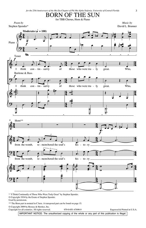 A text whose message reminds us of those qualities of ambition and striving, passion and spirit lends itself beautifully to this triumphant music. The opening vocal fanfares and closing hymn are sung with majesty and conviction; the inner passages with lyricism and warmth. F Horn part included. Duration: ca. 4:15.