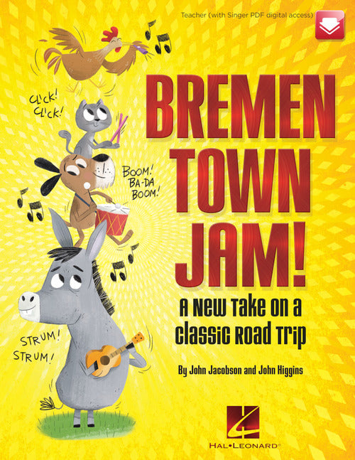 Join a pair of modern day Brothers Grimm and a delightful re-telling of their famous take on the classic tale, the Bremen Town Musicians. In this musical version, you will meet the same lovable characters from the original story, a Donkey named Chocolate and his friends the hound, cat and rooster as they make their way to Bremen Town to join other musicians in an unforgettable JAM session. Along the way, they'll meet a ridiculous room of rascally robbers who need to be taught a lesson. In the end, all will learn the value of sticking together with your friends and ultimately making beautiful music together. This 25-minute musical features five original songs and easy-to-learn rhyming dialog with over 50 speaking parts adaptable to various cast sizes. The Teacher Edition includes piano/vocal arrangements with choreography, helpful production guide and digital access to PDFs of melody sheets, lyric sheets and dialog. To perform with recordings, there are 2 options. A Performance/Accompaniment CD is available separately. For cost-saving value, the Performance Kit/Audio Access includes the Teacher Edition and digital access to performance/accompaniment audio recordings. Dialog not recorded. Approx. 25 minutes. Suggested for grades 1-3.