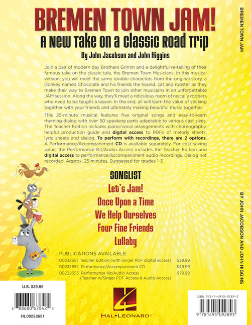 Join a pair of modern day Brothers Grimm and a delightful re-telling of their famous take on the classic tale, the Bremen Town Musicians. In this musical version, you will meet the same lovable characters from the original story, a Donkey named Chocolate and his friends the hound, cat and rooster as they make their way to Bremen Town to join other musicians in an unforgettable JAM session. Along the way, they'll meet a ridiculous room of rascally robbers who need to be taught a lesson. In the end, all will learn the value of sticking together with your friends and ultimately making beautiful music together. This 25-minute musical features five original songs and easy-to-learn rhyming dialog with over 50 speaking parts adaptable to various cast sizes. The Teacher Edition includes piano/vocal arrangements with choreography, helpful production guide and digital access to PDFs of melody sheets, lyric sheets and dialog. For cost-saving value, the Performance Kit/Audio Access includes the Teacher Edition and digital access to performance/accompaniment audio recordings. Dialog not recorded. Approx. 25 minutes. Suggested for grades 1-3.