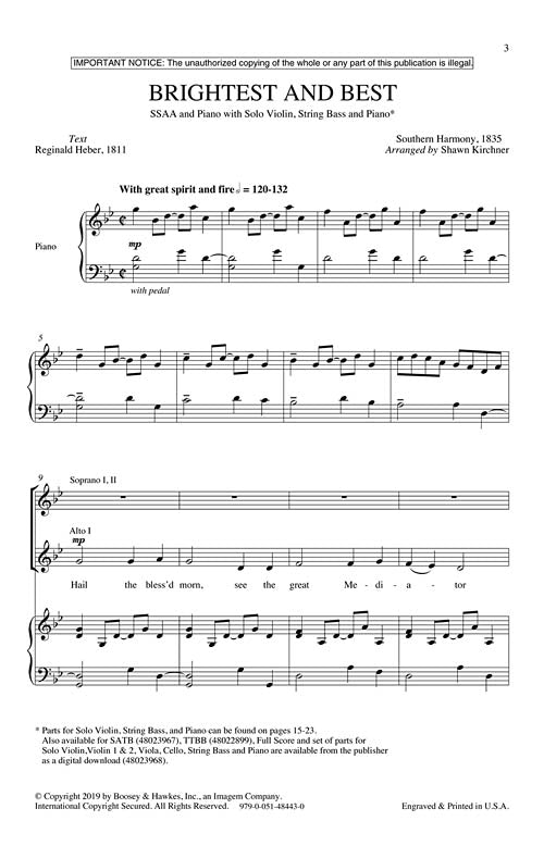 Now available for SSAA, this lively arrangement of the early American hymn tune STAR IN THE EAST has a stylized banjo-inspired piano accompaniment. Optional fiddle and string bass part, along with an altered piano part are included in the back of the choral score. There is also a full score and set of parts available for solo violin, violin, viola, cello and bass.