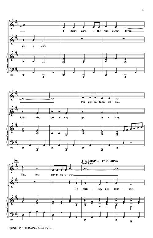 Four rain-themed folk songs combine to create a delightful medley that is ideal for introducing three-part singing and is also a lot of fun to perform! Includes: I Don't Care if the Rain Comes Down; It's Raining, It's Pouring; Rain, Rain, Go Away; Raining Again Today. Duration: ca. 2:40.