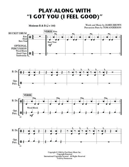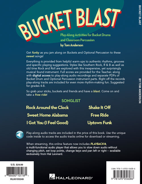 Get funky as you jam along on buckets and optional percussion to these sweet songs! Everything is provided from helpful warm-ups to authentic rhythm sections, grooves and specific playing suggestions. Styles like Southern rock, R&B as well as old time rock and roll are explored with this inexpensive, yet surprisingly musical found instrument. Full scores are provided for the teacher, along with digital access to play-along audio recordings and separate PDFs of bucket drum and optional percussion instrument parts. Right off the records play-along tracks are included for even more rhythm-making fun. So grab your sticks, buckets and friends and have a blast. ft.Come on and take a Free Ride ft.! Songs include: Free Ride, I Got You (I Feel Good), Rock Around the Clock, Shake It Off, Sweet Home Alabama, Uptown Funk. Suggested for grades 4-8.
