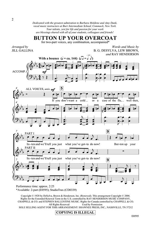 For the holidays or your winter concert, this bouncy arrangement of the well-known popular tune is sure to please. Jill has placed the basic song in a lively 2-part voicing and written a jazzy accompaniment that is novel and light. Opportunities abound to add some simple props, costumes and even movement! Available separately: 2-part (partner song); StudioTrax CD.
