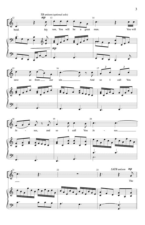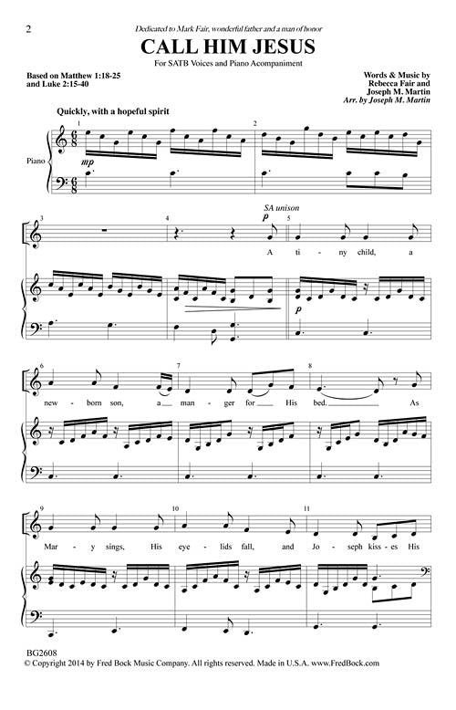 Joseph Martin is reliable - his melodies are always catching and his accompaniments natural to the touch. He has partnered with Rebecca Fair for this flowing anthem that celebrates the life and name of Jesus. Including the hymn O HOW I LOVE JESUS with new words was a brilliant idea. Imagine Joseph's amazement when an angel of the Lord appeared in his dream, telling him to take Mary as his wife...that she would have a son who was to be named Jesus for he will save his people from their sins. Today we are still amazed at the power of this name, and grateful that we, too, can Call Him Jesus.