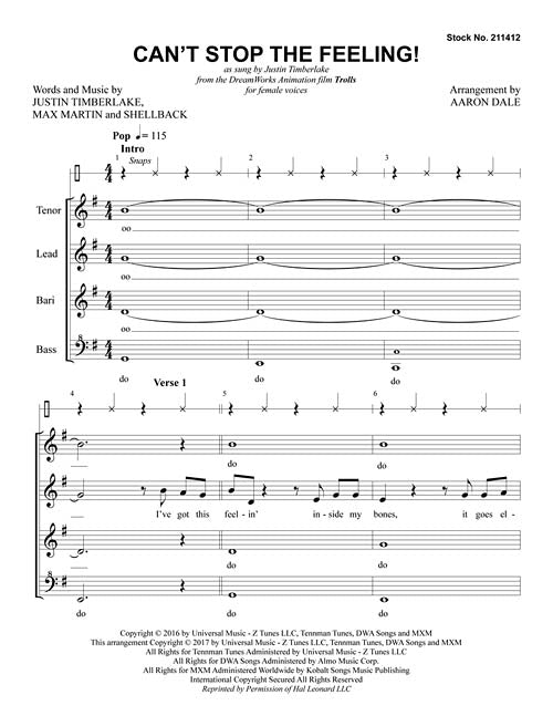 Catchy, infectious, and downright fun to sing, this 2016 smash hit by Justin Timberlake, featured in the DreamWorks Animation film Trolls, is a must-have for your quartet or chorus repertoire. Aaron Dale delivers an accessible arrangement, suitable for any strong ead or Lead section, that stays true to the original and will bring your audiences to their feet, singing and clapping along!